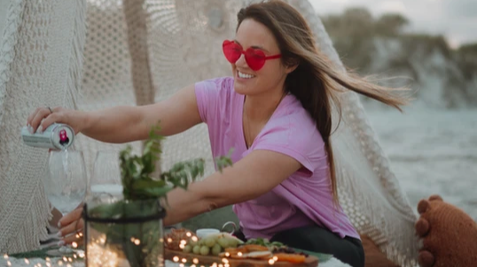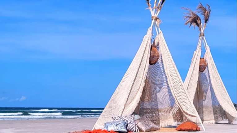 Enjoy a luxurious beach picnic with a plush teepee setup, gourmet charcuterie, and stunning ocean views, perfect for a memorable evening